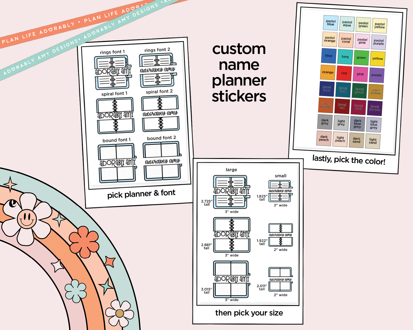 These stickers are custom with your name/words of choice. Please be sure to click ALL options!! All names are done in lower case, no upper case.