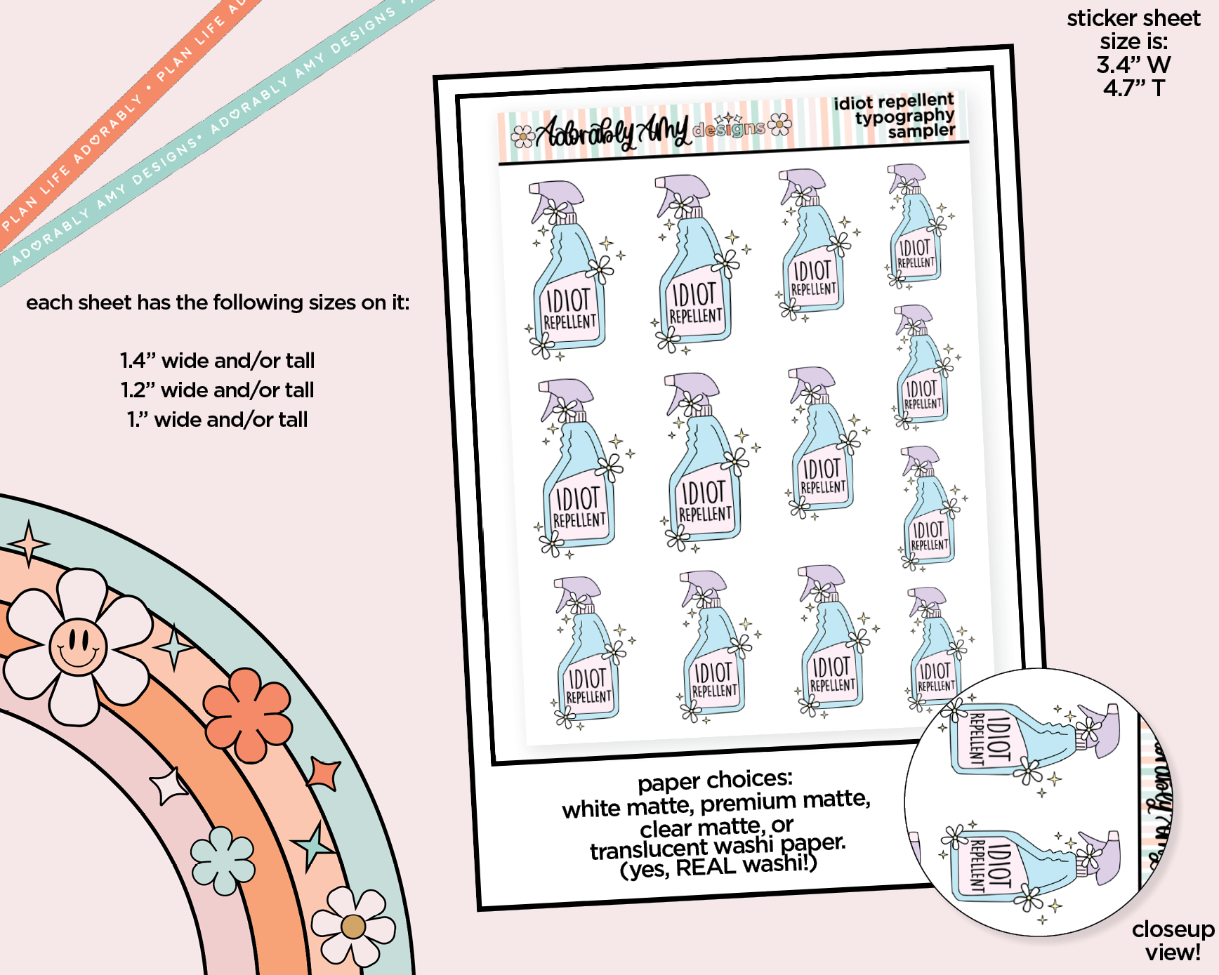 Avoid idiotic mistakes with our Idiot Repellent Typography Sampler Planner Stickers. This sticker sheet is an essential tool for the planner enthusiast. Keep your planner organized and stylish with our quirky and fun stickers.