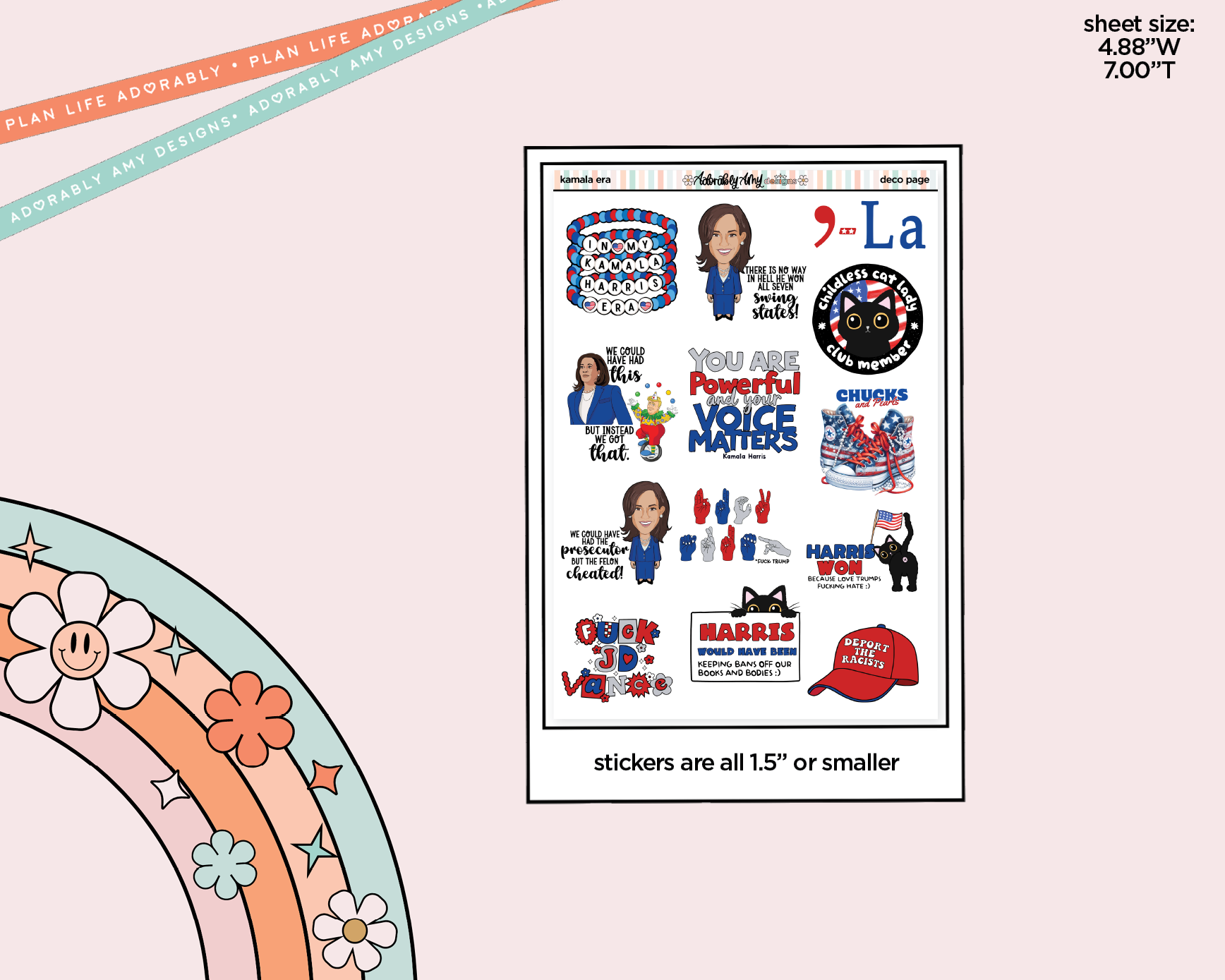 Add a splash of fun and flair to your planner with the In My Kamala Era Deco Sampler Planner Stickers! Perfect for brightening up your daily schedule, these playful stickers bring a unique, spirited vibe to your organization. Whether you're marking important dates or just jazzing up your pages, these stickers make planning a joyful experience. Let your creativity run wild and celebrate every moment with style!