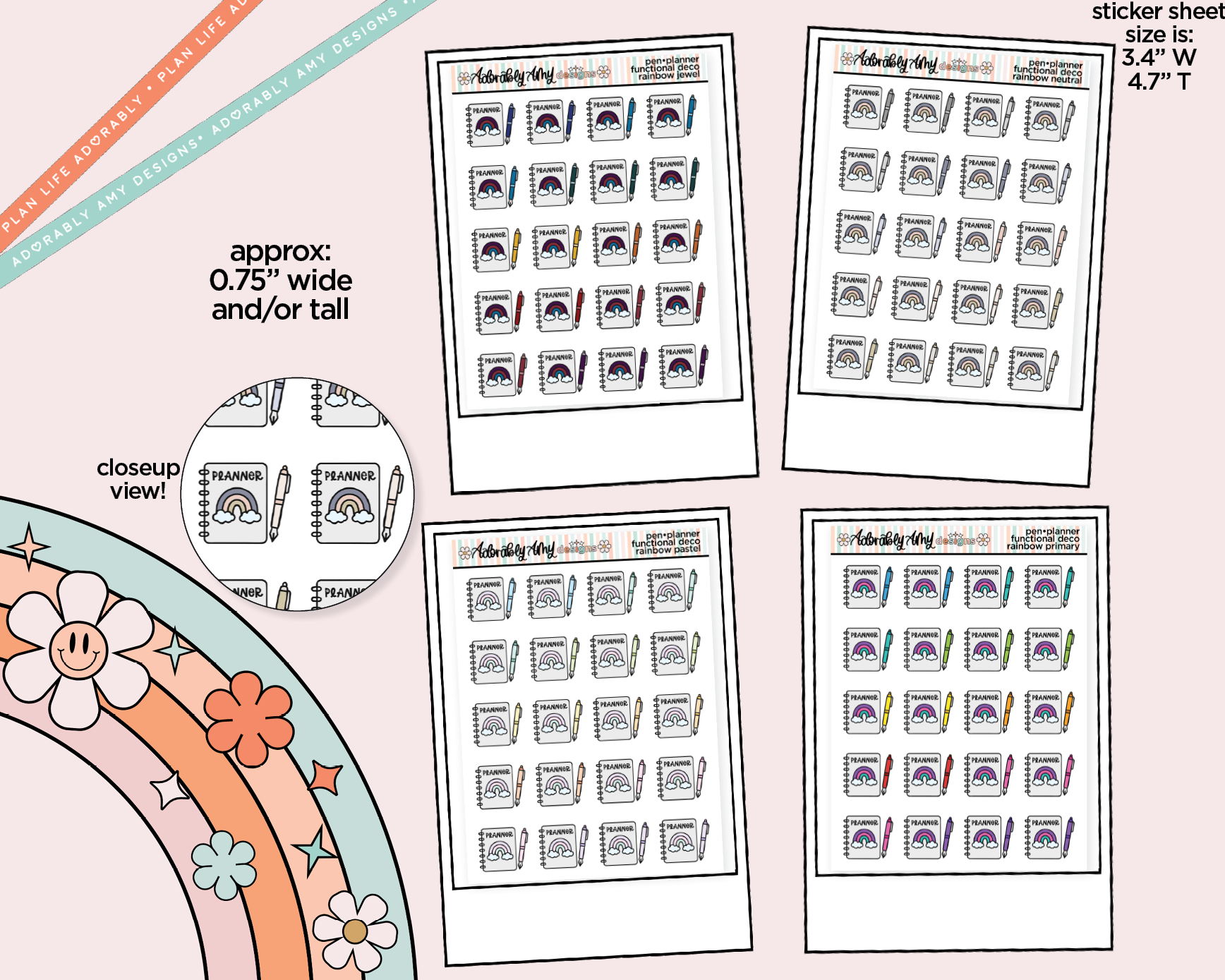 Each design features a spiral planner with a rainbow cover and a coordinating pen, making them perfect for marking planner sessions, setup days, or creative journaling time.