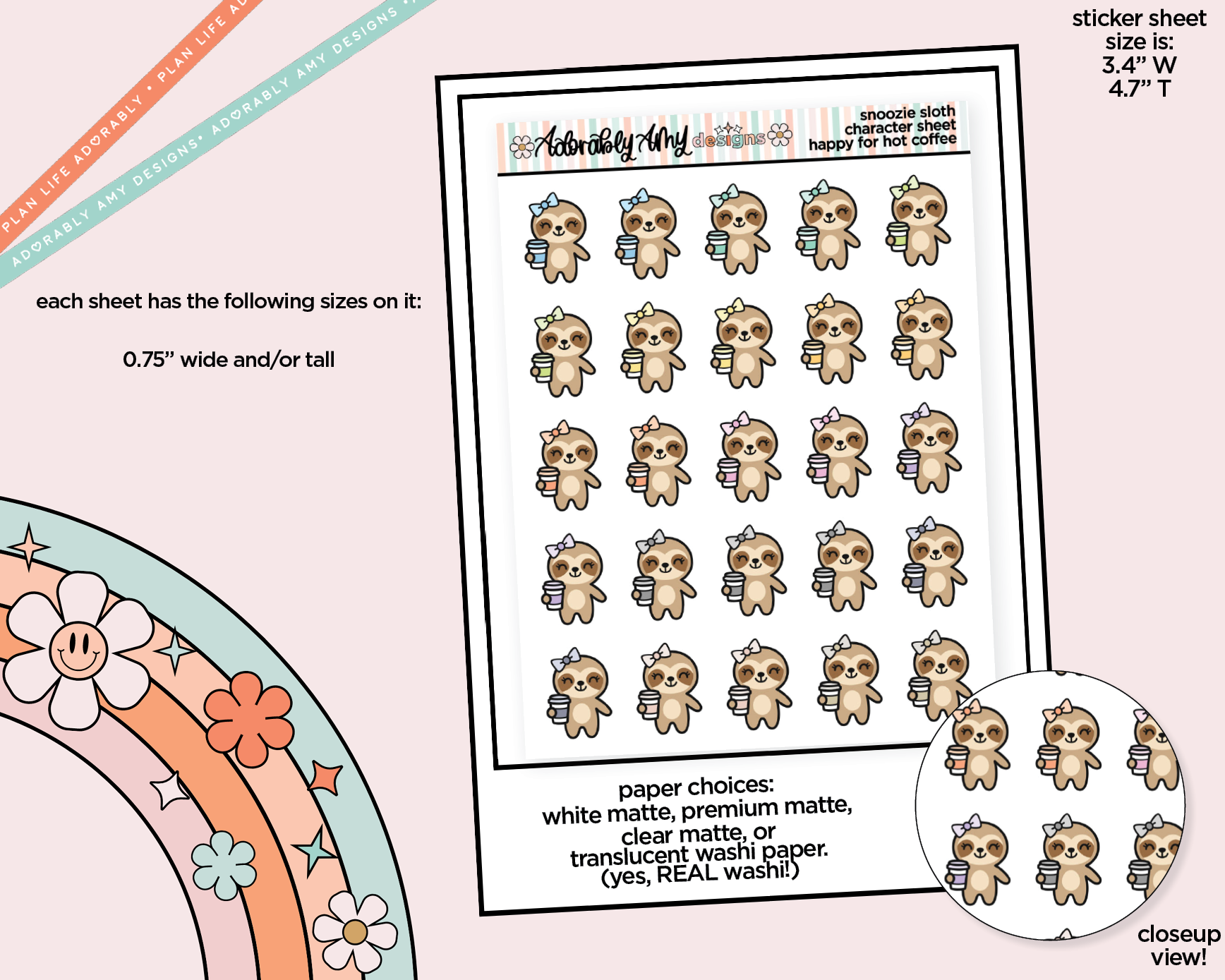 There are four papers available for all these stickers. Our normal high quality bright white sticker paper or the super thin and soft Premium Matte Thin paper. This paper is PERFECT for the Hobo Cousin because the paper is so thin and flexible so obviously, I recommend that one, though it does have a small upcharge. It is also available on clear matte paper OR super thin Washi Paper, yes REAL washi paper! Washi paper is NOT repositionable once you stick it down all the way!!