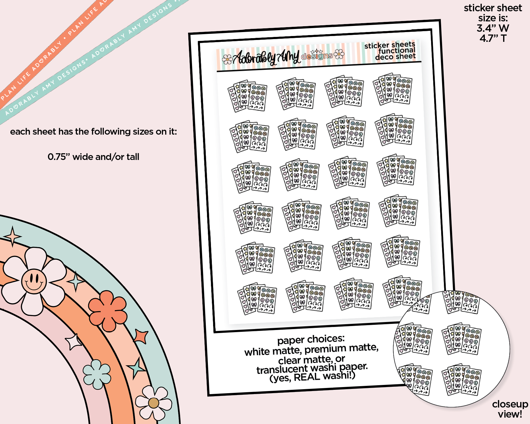 📏 Size: Each sticker is approx. 0.75” wide and/or tall; sheet measures 3.4” W x 4.7” T