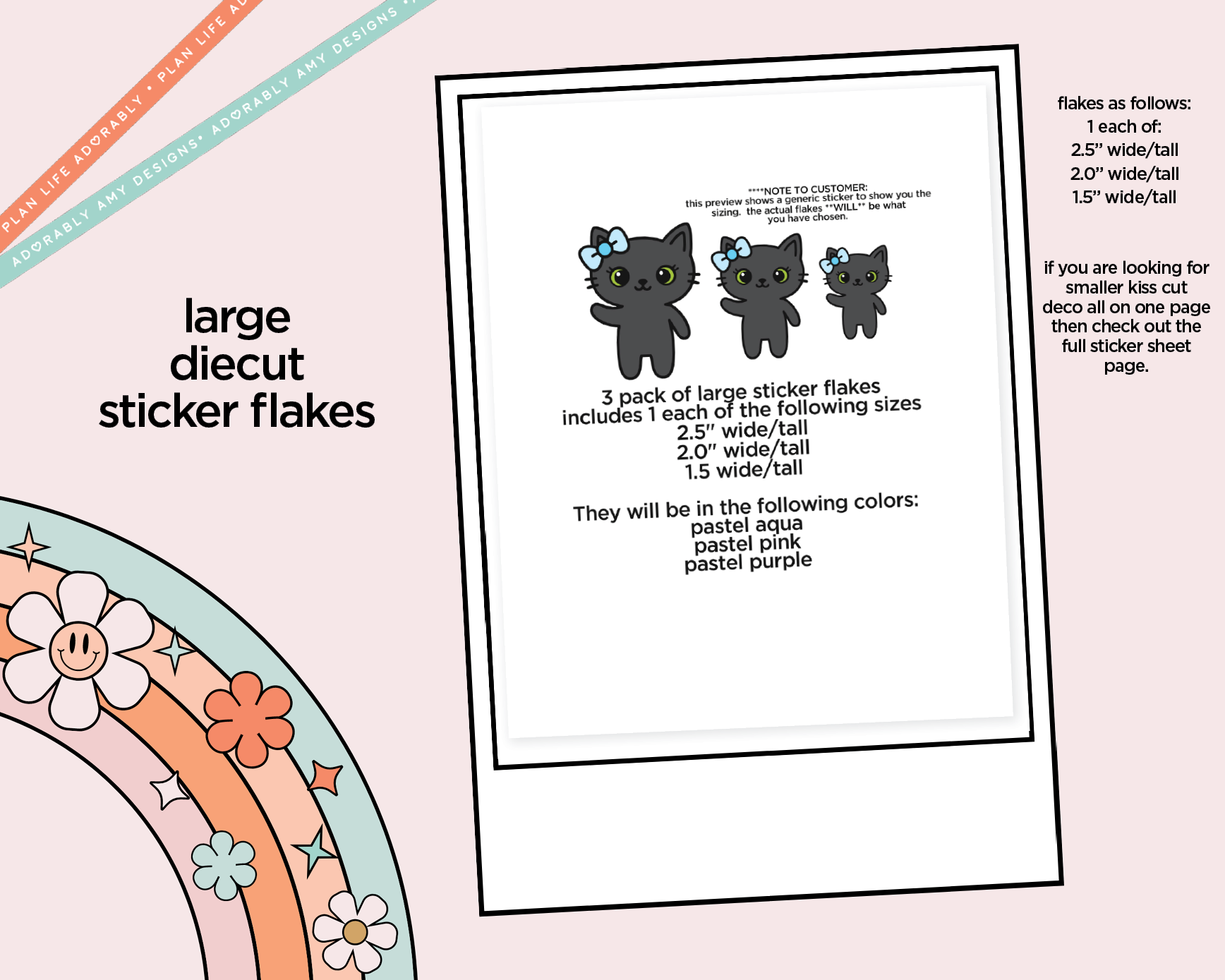 Want to go bigger? This listing also has large die-cut versions of the same adorable stickers! You get 3 sticker flakes that are (1 each) 2.5", 2" and 1.5" tall/wide (style dependent) and individually cut — perfect for journaling, dashboards, scrapbooking, tip-ins, cards, or adding a standout moment to your planner. They are in the three colors, pastel aqua, pastel pink and pastel purple.